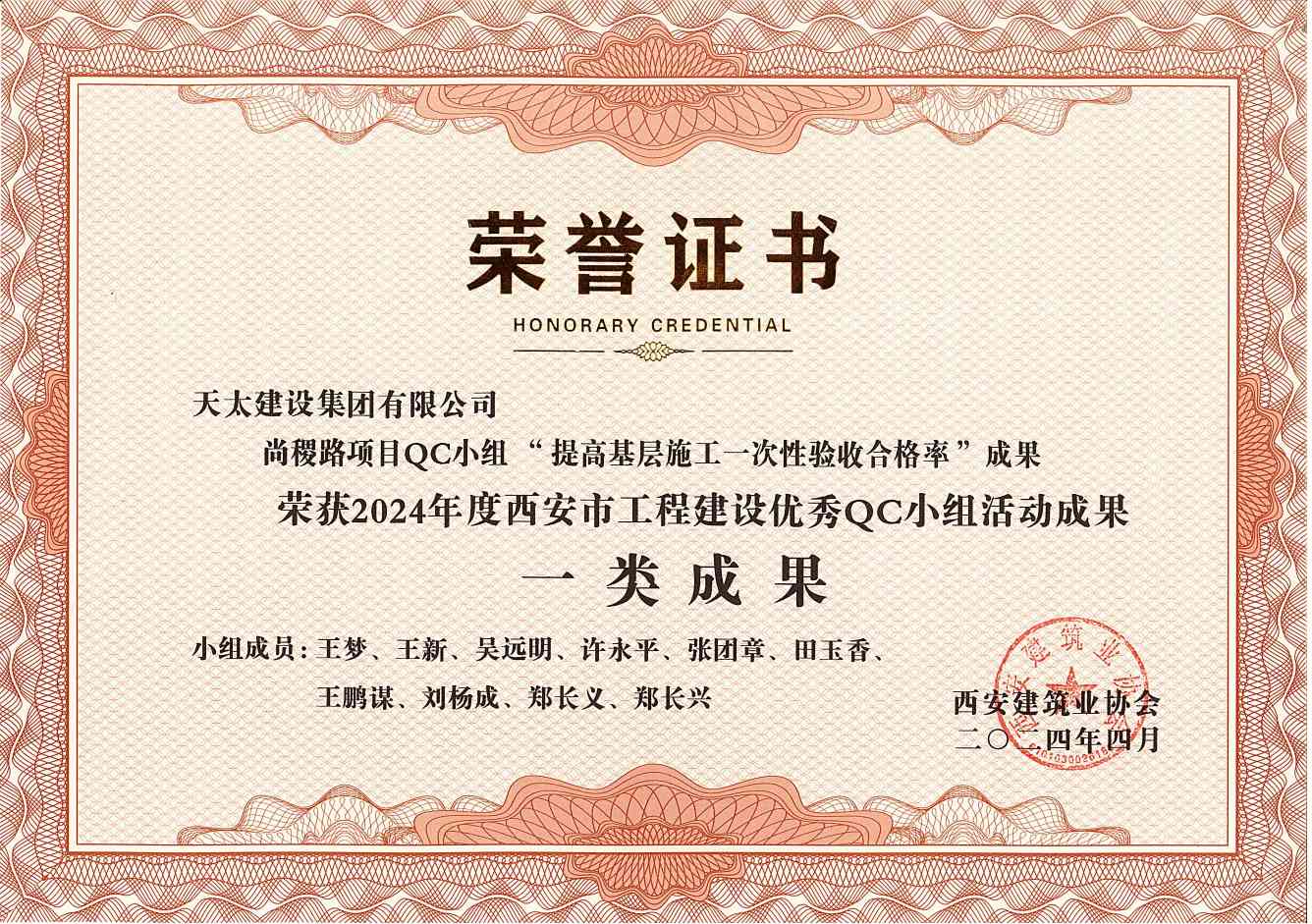 2024年度西安市工程建設優秀QC小組活動成果獎項
