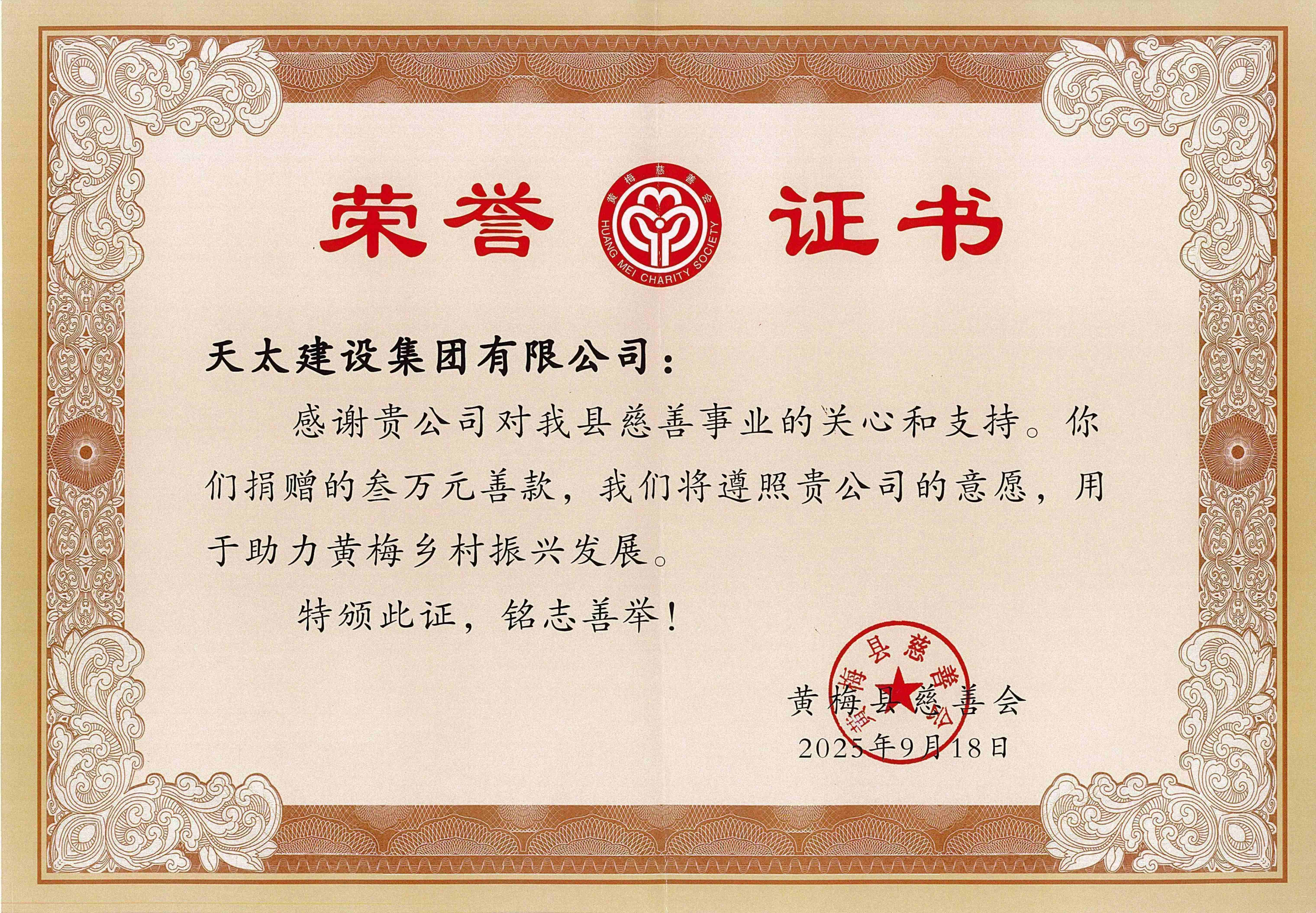 黃梅縣慈善會捐贈榮譽證書
