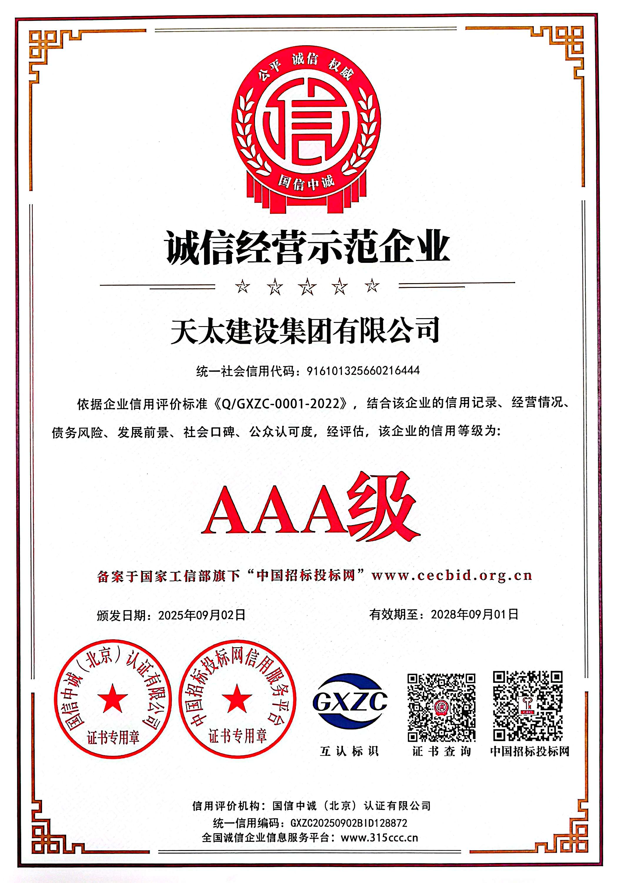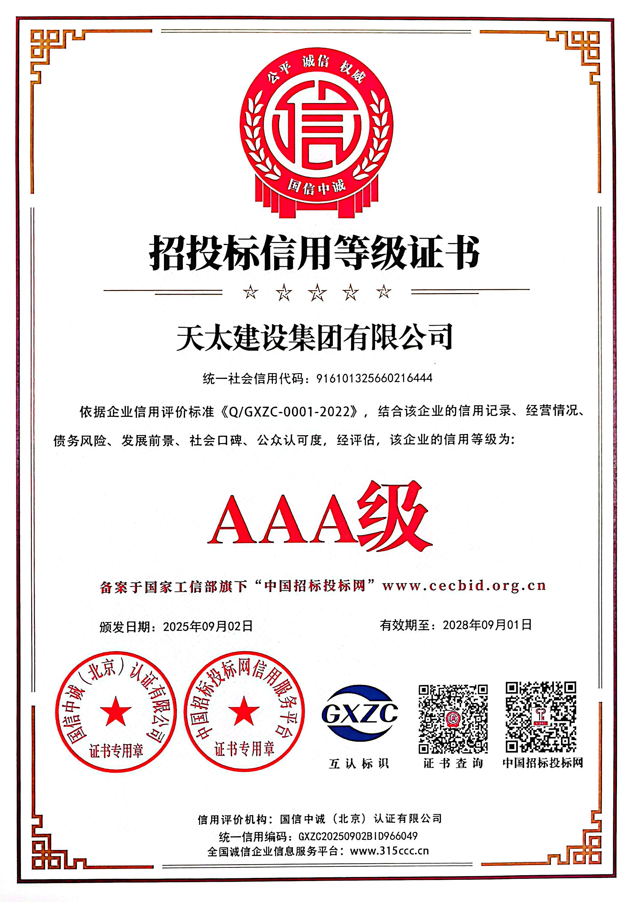 AAA級招投標信用等級證書